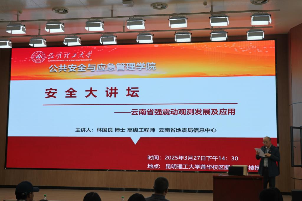 结合学院学科专业特色,开展安全大讲坛第一讲。讲座邀请云南省地震局信息中心高级工程师林国良博士到校做题为《云南省强震动观测发展及应用》的学术讲座。学院相关负责人、全体党员、相关专业领域师生代表参加讲座。